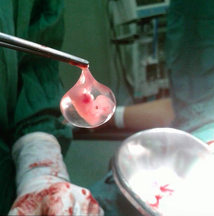 The smallest little embryo with its amniotic sac! How many weeks old is it in your opinion? This is a case of a miscarriage (or spontaneous abortion), which is the spontaneous loss of a fetus before the 20th week of pregnancy, or in this case even before the 12th week. Keep in mind that miscarriage is a naturally occurring event due to some complications and has nothing to do with medical or surgical abortions, or any interruption of the pregnancy! The common reasons pregnancies miscarry are chromosome problems, abnormal physical development or an abnormal placental development. Other causes can be infections, uterine problems, diseases of the mother (diabetes, lupus, thyroid disease), trauma, and unhealthy lifestyle (obesity, drug and alcohol use). The photo shows the embryo still with its intact amniotic sac and umbilical cord. The tiny black dot is the developing eye, and the reddish tissue in the center is the heart.