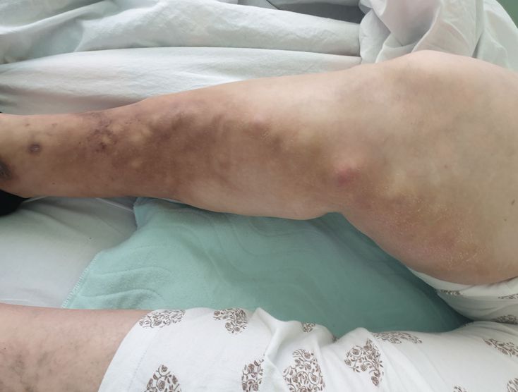 Female patient, 34 years old, is hospitalized in the surgery department with thrombophlebitis of the right leg. She had areas of ulceration and necrosis at the internal ankle. The thrombosis started at the right calf 1 month ago and extended to the right hip via saphenous vein. There was formed a chain of thrombi. The patience has a family history of thrombophlebitis. She had a surgery with the extrusion of the saphenous vein and drainage to the femoral vein.