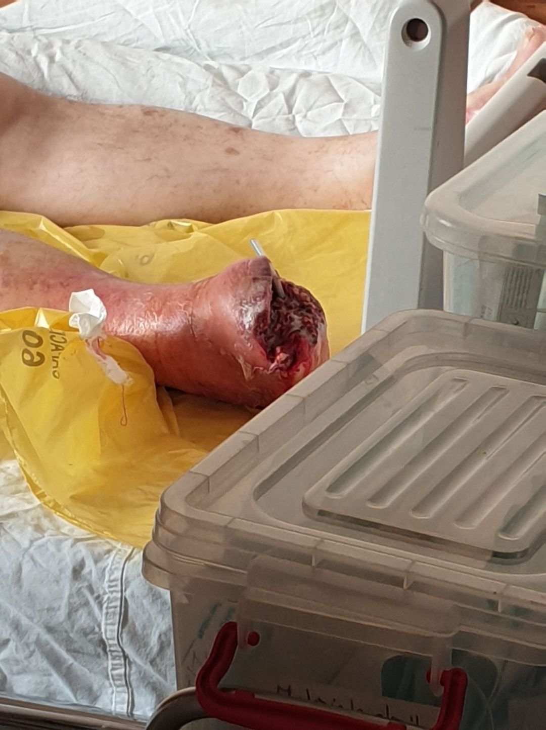 Patient, 63 years old, presented to the Emergency Room with gangrene of the right foot, due to diabetes type 2. He was operated and his right foot was amputated almost entirely. In his right leg was put a drainage tube.