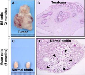 (Photo from : openi.nlm.nih.gov) . . The result of formation of a tumor mass that contain a variety of mature tissue arranged in an unorganized fashion = teratoma. . . Teratoma in testis are rare than in ovaries. . . Teratoma in testis are composed if less differentiated tissues that usually lead to malignancy. These tissues are thought to arise through parthenogenesis of oocytes. . . [source : 4th edition of Histology text and Atlas by M.H.Ross, G.I.Kaye and W. Pawlina - page 82]