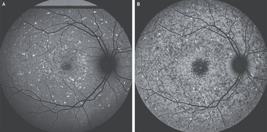 A 13-year-old boy was referred to the ophthalmology clinic with enlarging blind spots in the central vision in both eyes. He had no family history of eye problems. At presentation, the visual acuity was 20/40 in the right eye and 20/50 in the left eye. Fundus examination of both eyes showed widespread, yellow, pisciform flecks. Short-wavelength autofluorescence imaging showed diffuse hyperautofluorescent lesions suggestive of bisretinoid accumulation and patchy central areas of atrophy of the retinal pigment epithelium with peripapillary sparing (Panel A). These findings are consistent with a diagnosis of Stargardt juvenile macular degeneration (also called Stargardt’s disease), an autosomal recessive disorder caused by mutations in the gene encoding ATP-binding cassette subfamily A member 4 (ABCA4). Dysfunction of the ABCA4 transporter leads to the accumulation of toxic bisretinoids with consequent degeneration of the retinal pigment epithelium and photoreceptors. Vision loss typically begins during childhood and progresses. The diagnosis was confirmed with sequencing of ABCA4. The patient was advised to avoid vitamin A supplementation, which may accelerate bisretinoid accumulation. At 6-year follow-up, visual acuity was 20/70 in the right eye and 20/50 in the left eye, with worsening central scotomata. Autofluorescence imaging showed progressive atrophy in the previously identified areas of pisciform flecks with the maintenance of peripapillary sparing