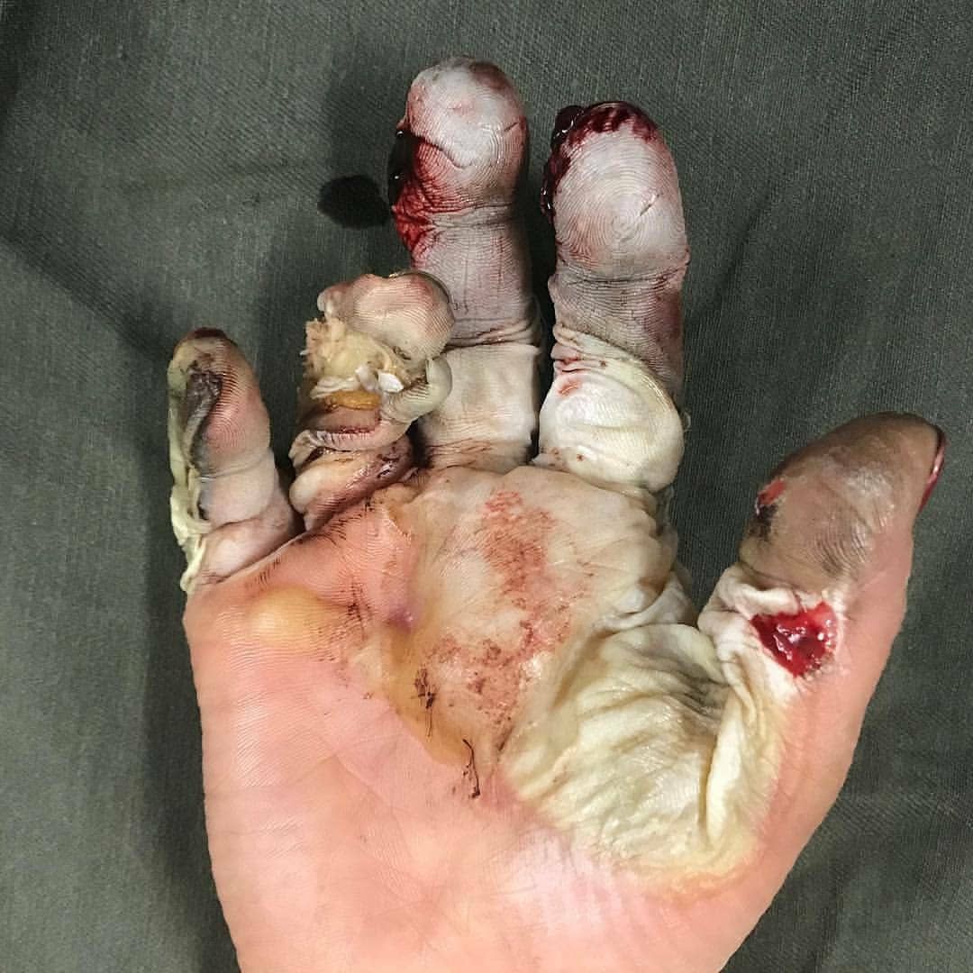 A case of a female patient who got her hand trapped in between tow heavy duty/ high pressure rollers which were also heated. The result was a crushed hand with third degree burns of the fingers and palm. Every time a mangled tissue gets exposed to heat/burned, the chances of survival drop dramatically, this is due to poor tissue blood supply. The palm of the hand comprises only one percent of the body surface area. Despite this, a burn of the hand can represent a serious short- or long-term disability. Edema formation in burned hands hinders motion and may be a factor in later contracture formation. The hands must be elevated above the level of the heart to prevent edema formation. Changes in or loss of pulse indicate the need for escharotomy if hand or arm burns are circumferential. Credit: @reconst.surg.col