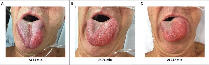 A 78-year-old man presented to the emergency department with weakness on the left side that had developed 90 minutes earlier. He had no history of use of angiotensin-converting–enzyme (ACE) inhibitors. An ischemic stroke in the territory of the right middle cerebral artery was diagnosed, and intravenous tissue plasminogen activator (t-PA) was initiated. Fifty-four minutes after the infusion was initiated, swelling of the left side of the tongue was noted (Panel A), and the t-PA was stopped. The swelling progressed (Panel B, 76 minutes after initiation of t-PA; Panel C, 117 minutes after initiation of t-PA). The patient had no shortness of breath or pain, and there was no evidence of airway compromise. Orolingual angioedema is a known potential adverse effect of t-PA. The swelling can be asymmetric at first and can develop in a location contralateral to the ischemic lesion. Orolingual angioedema may occur most often in patients who have had a stroke that involved the insula or in patients who have received treatment with an ACE inhibitor. The mechanism is incompletely understood. Treatment in this case included intravenous antihistamines and glucocorticoids, without advanced airway management. The tongue swelling resolved, but at a follow-up visit 3 months after presentation, some neurologic deficits resulting from the stroke remained.