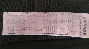 It's a ventricular tachycardia with abnormal P wave and narrowing QRS complex, and heart rate is about 300. Treatment for this condition is shock and lidocaine. If the patient is unresponsive, intravenous amiodarone.