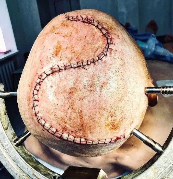 The picture shows a magnificent S-shaped incision after the removal of a giant parasagittal meningioma. Image credit: https://www.instagram.com/p/CMn-yyllDz6/?igshid=3x40ae4oas71