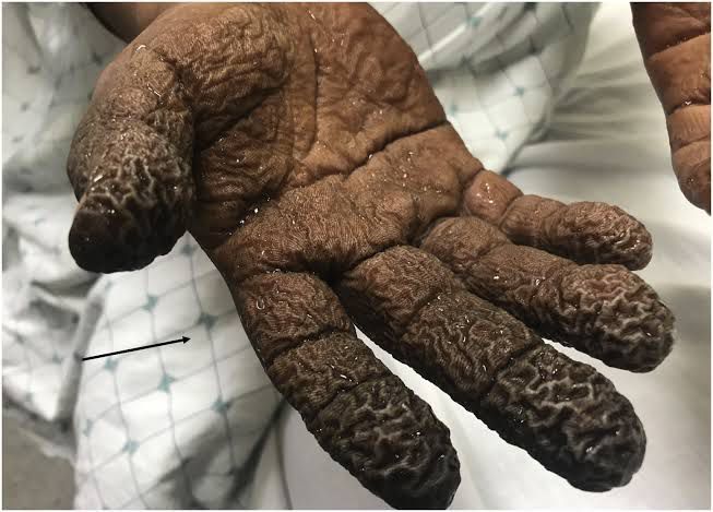 A 33-year-old man showed up to the Emergency Department with chemical burns on his hands from handling paint thinner without using gloves. He had approximately 7 h of direct contact of Klean-Strip on his bilateral hands. Klean-Strip is comprised primarily of Stoddard solvent, a petroleum-derived mixture of organic hydrocarbons. The patient reported severe burning pain throughout his palms and fingers. The palms of his hands were discolored and waxy, with a leather-like texture, particularly at his fingertips. Burns with organic solvents particularly hydrocarbons cause a corrosive dissolution of lipids, unlike thermal burns, which cause local tissue denaturation and release of local inflammatory mediators due to an exothermic reaction. Credits: https://www.jem-journal.com/article/S0736-4679(20)30007-X/fulltext
