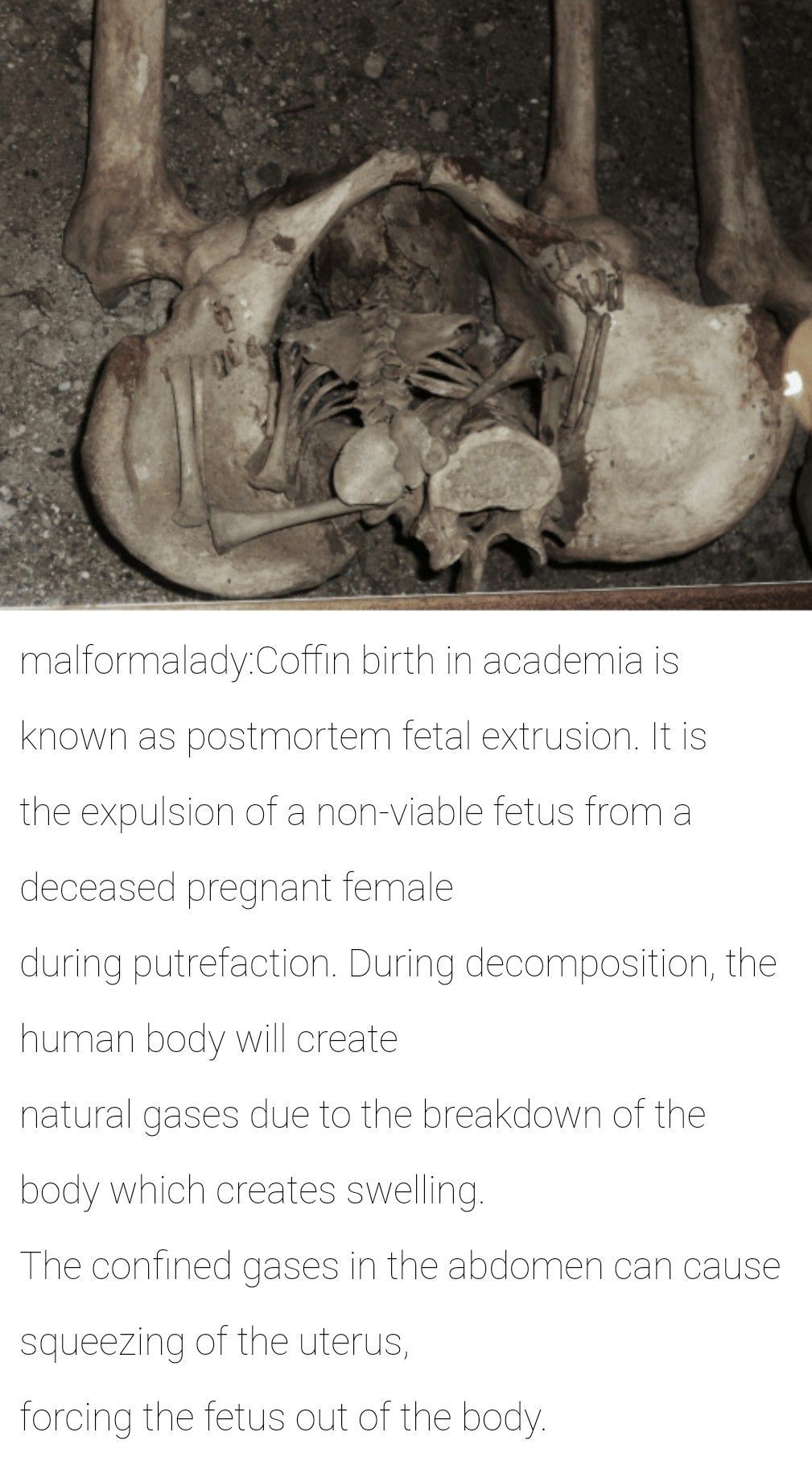 What do you know about coffin birth? I personally haven't seen anything like this before, and it was never mentioned during my medical career, however while i was reading about OBGYN, i stopped at an article on coffin birth, i was excited to know more about this topic. Coffin birth is a postmortem fetal extrusion, through the vaginal opening of a deceased woman. Few days after the death when the body starts to decompose, by the fact on no more oxygen circulating in the body, anaerobic bacteria starts to proliferate more and more and to secrete several exoenzymes, to break the tissues. Due to these factors, the body tissue starts to necrotizing which will lead to the break of the amniotic membranes, eversion and prolapse of the uterus and finally expulsion of the dead fetus.