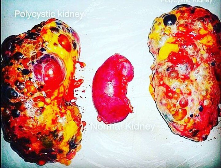 The image presents a comparison between normal and Polycystic kidney. Polycystic kidney disease (PKD) is an inherited disorder presenting clusters of noncancerous fluid-filled cysts, primarily within the kidneys.It causes the kidneys to enlarge and lose function over time. Image by : https://www.instagram.com/p/CHCNVMHhylA/?igshid=mg9ykw2g804l