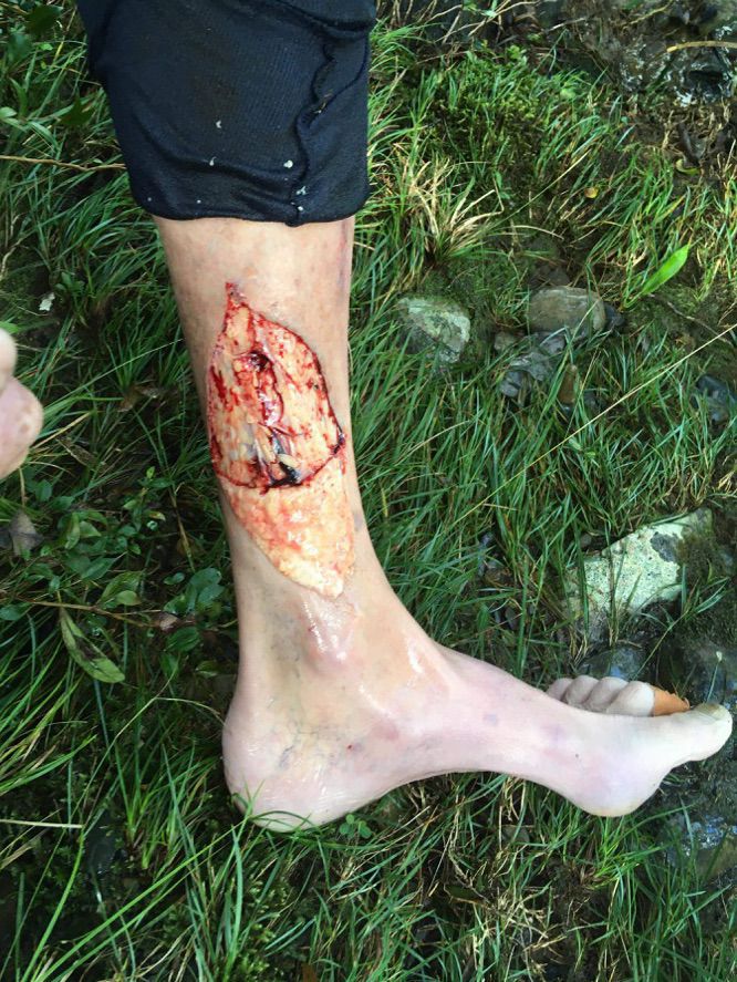 A foot entrapment is where someone swimming/floating down flowing swift-water has their foot wedged in between objects underneath the water. This can be fatal as the victim will be stuck with water pushing on them, causing them to be pushed forward whilst stuck in place, in turn pushing their head down under water due to the excess force, this usually results in drowning. This victim however knew and understood what would happen if he stayed entrapped so instinctively ripped his leg out from the entrapment, resulting in the above picture...