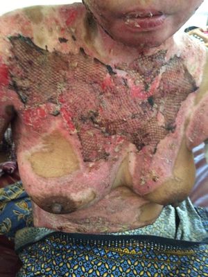 The patient is 45 years old, Prey Veng Province, Cambodia. She just got injuries from flamed petroleum during complete daily task. The wound was happen over the anterior tummy and chest. The wound is making the new dressing every two or three day. After 3 weeks, about 65 percentage was proper healing while the granulation tissues still be remained on the anterior chest. Then the doctor decided to do the flit thickness skin graft. This picture is taken 7 day after skin graft and it is successfully grafting. Burn and Plastic Surgery Service, Preah Kossamak Hospital, Phnom Penh City, Cambodia.