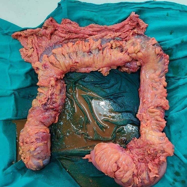 Total abdominal colectomy is the removal of the large intestine. Traditionally, colectomy is performed via an abdominal incision (laparotomy), though minimally invasive colectomy, by means of laparoscopy, is growing both in scope of indications and popularity. Resection of any part of the colon entails mobilization and ligation of the corresponding blood vessels. Lymphadenectomy is usually performed through excision of the fatty tissue adjacent to these vessels (mesocolon), in operations for colon cancer. When the resection is complete, the surgeon has the option of immediately restoring the bowel, by stitching or stapling together both the cut ends (primary anastomosis), or creating a colostomy. Credit: Dr. Ayaz Rashid