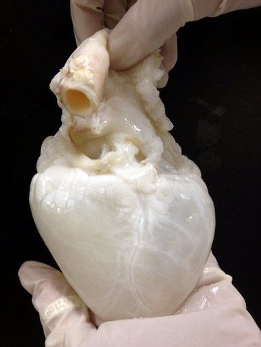 A ghost heart is essentially a heart from which we've removed all the cells, leaving the scaffold behind where the cells normally reside. And if you look at it, it looks like a heart and still has all the components of a heart, except the cells. So it looks like a white translucent but opaque heart