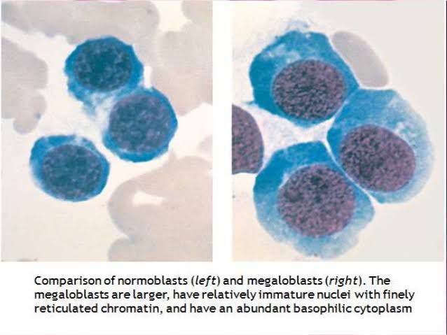 Tetrahydrofolate (THF) is the functional form of Folic Acid which receives and transfers one carbon fragments to the intermediates in synthesis of purines and pyrimidines for DNA. Deficiency of THF results in diminished synthesis of neucleotides which leads to inability of rapidly dividing cells to make DNA and therefore inability to divide, such cells include RBC precursor cells aka Megaloblasts in bone marrow which are released in the blood, they are unusually large, structurally abnormal, immature RBCs. Methyl Cobalamine is the active form of Vit B12 which acts as an enzyme for remethylation of Homocysteine to Methionine. Here, methyl group for remethylation of Cobalamine and hence Homocystein is provided by methyl-THF. When Vit-B12 is absent, these reactions can not occur and hence folic acid gets trapped in its methylated form which accumulates and the other functional forms decrease, therefore barring the rapidly dividing cells from maturation and division. Thus, Vit-B12 deficiency leads to deficiency of THF forms needed in DNA synthesis (by trapping it in methylated form), resulting in megaloblastic anemia.