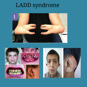Lacrimoauriculodentodigital (LADD) syndrome is a multiple congenital anomaly syndrome and an autosomal dominant disorder characterized by mutations in the fibroblast growth factor 10 gene characterized by hypoplasia, aplasia or atresia of the lacrimal system; anomalies of the ears (cup shaped ears )and hearing loss ; hypoplasias, apalsias or atresias of the salivary glands; dental anomalies which includes hypodontia,microsomia, mild enamel hypoplasia and digital malformations.