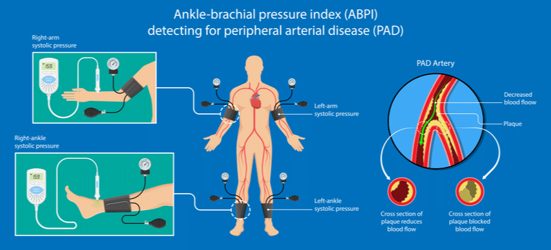 The ankle-brachial pressure index is a simple noninvasive way to detect peripheral arterial disease. The systolic pressures at the arm and ankle are compared to estimate the degree of narrowing of the vessels supplying the lower limb. Normal ABPI is about 1. An ABPI of above 1.4 suggests excess vascular calcification while values below 1 indicate peripheral arterial disease. If the ABPI has gone below 0.4, this is referred to as critical limb ischemia and in this case, the limb is at risk of developing ischemia and necrosis. https://www.santancv.com/services/diagnostic-testing/ankle-brachial-index-test/