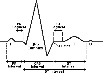 ▪ An electrocardiogram (ECG) reflects the electrical activity of cardiac cells and records electrical activity at a speed of 25 mm/second. ▪ An electrocardiographic strip consists of horizontal lines representing seconds and vertical lines representing voltage. ▪ Each small square represents 0.04 second. ▪ Each large square represents 0.20 second. ▪ The P wave represents atrial depolarization. ▪ The PR interval represents the time it takes an impulse to travel from the atria through the atrioventricular node, bundle of His, and bundle branches to the Purkinje fibers. ▪ Normal PR interval duration ranges from 0.12 to 0.2 second. ▪ The PR interval is measured from the beginning of the P wave to the end of the PR segment. ▪ The QRS complex represents ventricular depolarization. ▪ Normal QRS complex duration ranges from 0.04 to 0.1 second. ▪ The Q wave appears as the first negative deflection in the QRS complex and reflects initial ventricular septal depolarization. ▪ The R wave is the first positive deflection in the QRS complex. ▪ The S wave appears as the second negative deflection in the QRS complex. ▪ The J point marks the end of the QRS complex and the beginning of the ST segment. ▪ The QRS duration is measured from the end of the PR segment to the J point. ▪ The ST segment represents early ventricular repolarization. ▪ The T wave represents ventricular repolarization and ventricular diastole. ▪ The U wave may follow the T wave. ▪ A prominent U wave may indicate an electrolyte abnormality, such as hypokalemia. ▪ The QT interval represents ventricular refractory time or the total time required for ventricular depolarization and repolarization. ▪ The QT interval is measured from the beginning of the QRS complex to the end of the T wave. ▪ The QT interval normally lasts 0.32 to 0.4 second but varies with the client’s heart rate, age, and gender.