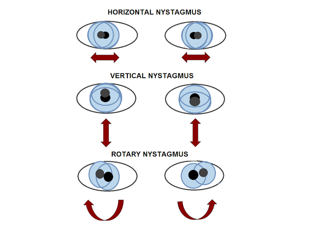 Nystagmus is continuous, uncontrolled movement of the eyes. Biphasic or jerk nystagmus is the most common type. It is characterised by slow drift in one direction, followed by fast correction/recovery in the opposite direction. The direction of the fast phase designates the direction of the nystagmus. If there are equal oscillations in both directions, it is called pendular nystagmus. Nystagmus is an involuntary rhythmic occilations of the eyes which can be vertical, rotatory or multidirectional. It may be continuous or paroxysmal or evoked by manoeuvres such as gaze or head position. The most common form, 'jerk nystagmus', consists of alternating phases af a slow drift in one direction with corrective saccadic 'jerk' in the opposite direction. The direction of the fast jerk is used to define the direction of nystagmus. Pendular nystagmus, in which there is a sinusoidal oscillation without a fast phase, is less common. Nystagmus may caused by disorders of the vestibular, visual or cerebellar pathway. What are the clinical pathologies in: ▪︎Jerk Nystagmus - Peripheral; Central; Dyconjugate/Ataxic ▪︎Pendular Nystagmus