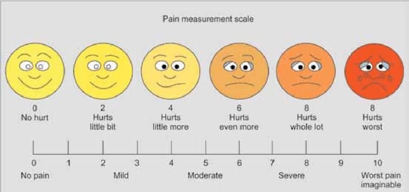 Wong-Baker Faces Pain Rating Scale shows a series of faces ranging from a happy face at 0 (no hurt), to a crying face at 10 (worst pain imaginable). It was developed by Donna Wong and Connie Baker.