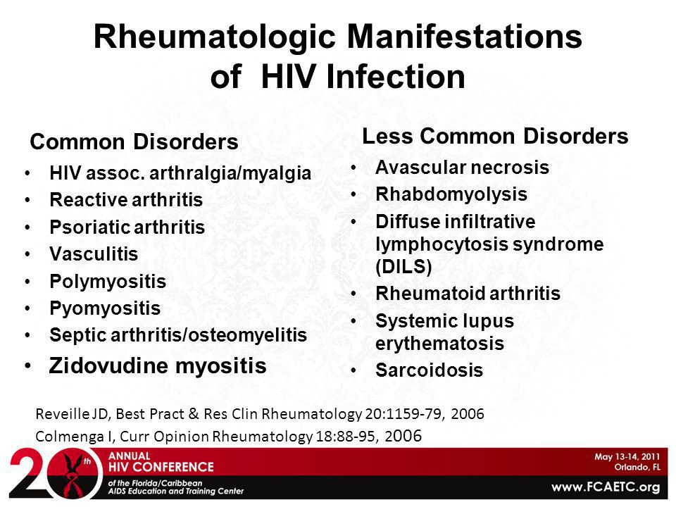 Infection with HIV has been associated with various rheumatic disorders, most commonly arthralgias and arthritis. HIV painful articular syndrome causes severe arthralgias in an oligoarticular, asymmetric pattern that resolves within 24 hours; the joint examination is normal. HIV-associated arthritis is an asymmetric oligoarticular process with objective findings of arthritis and a self-limited course that ranges from weeks to months. Psoriatic arthritis and reactive arthritis occur in HIV-infected individuals and can be severe; it remains uncertain whether the incidence of these disorders is increased in HIV-infected populations. These spondyloarthropathies can respond to NSAIDs, though many cases are unresponsive. In the era of highly active antiretroviral therapies, immunosuppressive medications can be used if necessary in HIV patients, though with caution. Muscle weakness associated with an elevated creatine kinase can be due to nucleoside reverse transcriptase inhibitor-associated myopathy or HIV-associated myopathy; the clinical presentations of each resemble idiopathic polymyositis but the muscle biopsies show minimal inflammation. Less commonly, an inflammatory myositis indistinguishable from idiopathic polymyositis occurs.