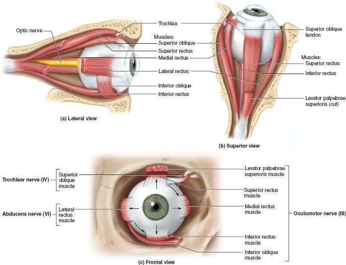 There are six extraocular muscles which help in the movement of the eyeball. They are innervated by either, Occulomotor nerve, Trochlear nerver or Abducens nerve 1. Superior Rectus: • Action: Elevation, adduction and medial rotation of eyeball • Innervation: Oculomotor nerve 2. Inferior Rectus • Action: Depression, adduction and lateral rotation of eyeball • Innervation: Oculomotor nerve 3. Medial Rectus: • Action: Adduction of eyeball • Innervation: Oculomotor nerve 4. Lateral Rectus: • Action: Abduction of eyeball • Innervation: Abducens nerve 5. Superior Oblique: • Action: Depression, abduction and medial rotation of eyeball • Innervation: Trochlear nerve 6. Inferior Oblique: • Action: Elevation, abduction and lateral rotation of eyeball • Innervation: Oculomotor nerve