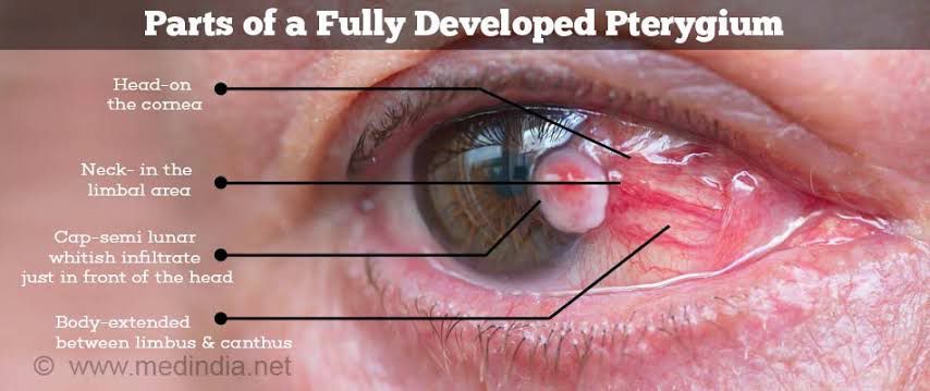 Pterygium is a pink fleshy, triangular growth of conjunctiva on the surface of eye. It is a painless and a slow growing condition most commonly seen on the medial surface of the eye. It consists of four parts: Head, Neck, Body and a cap. It is usually an asymptomatic condition but may end up causing vision defects like astigmatism and mechanical obstruction if the growth reaches the visual axis of cornea.