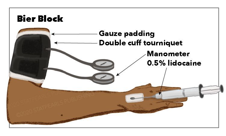 Bier block or intravenous regional anaesthesia (IVRA) is a local anaesthesia technique by which a intravenously injected local anaesthetic agent is isolated from the circulation in a target area. This block is achieved by exsanguination of the region of interest along with application of tourniquets to safely stop the blood flow. After that the anaesthetic agent is introduced into the venous system of the limb which diffuse into the surrounding tissue while tourniquets retain the agent within the targeted area. This technique is usually used for some brief surgical procedures or manipulations of the upper or lower extremity. This technique has found greatest acceptance for the upper extremities as lower extremity can have safety issues with it. Text Reference: https://www.nysora.com/techniques/intravenous-regional-anesthesia/intravenous-regional-block-upper-lower-extremity-surgery/ Image Source: https://www.statpearls.com/ArticleLibrary/viewarticle/18263