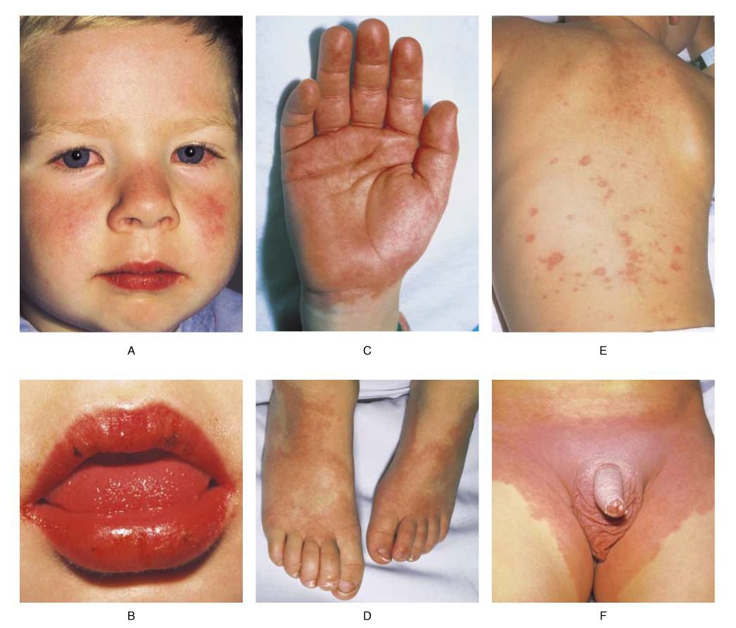 Kawasaki disease is an inflammatory disorder of medium-sized blood vessels. It majorly affects the coronary vessels thereby causing cardiac complications. It is an acute systemic disorder that affects children under 5 years of age. The Kawasaki disease presents with a variety of signs and symptoms: - Fever - Inflammation of oral mucosa and strawberry tongue - Conjunctival injection - Generalized rash The cardiovascular manifestations of Kawasaki disease are: - Coronary arteritis and eventual myocardial infarction - Myocarditis - Pericarditis - Coronary dilatation - Insufficient peripheral vascularization - Gangrene The cause of Kawasaki disease is idiopathic. It is hypothesized to occur as a consequence of an aberrant immune response to an infectious agent. The Kawasaki disease is treated by aspirin and I/V immunoglobulins. The dose of aspirin is 5 mg/kg OD for 2 weeks. IVIG is given for 4 days in dose of 400 mg/kg OD. Reference: Davidson’s Principles and Practice of Medicine, 23rd Edition Image via https://www.nejm.org/doi/pdf/10.1