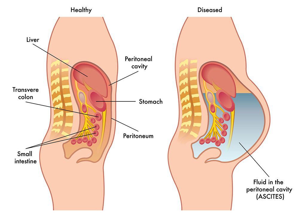 It is an accumulation of excess fluid at least 500mL in peritoneal cavity. There are several causes of ascites. Portal hypertension (sinusoidal hypertension) related causes include Cirrhosis, Acute hepatitis, Liver malignancy and right sided heart failure. Among non portal hypertension related causes Peritonitis (eg: tuberculosis), Pancreatitis, hypoalbuminemia, Meig's syndrome (ovarian tumor), Vasculitis are common. In ascites patient presents with signs of 1. Abdominal distension 2. Fluid thrill and shifting dullness to percussions. How will you manage this patient? Firstly restricting water and sodium intake in diet to stop further fluid leakage. Diuretics such as Spironolactone is drug of choice. In cases of refractory ascites i.e. diuretic resistant ascites, the first line of treatment is Large volume paracentesis. 3-5L per day of fluid is removed or until dry. Trans-jugular intra-hepatic portosystemic shunt (TIPSS) is also used for refractory cases. Image from alfapump.com