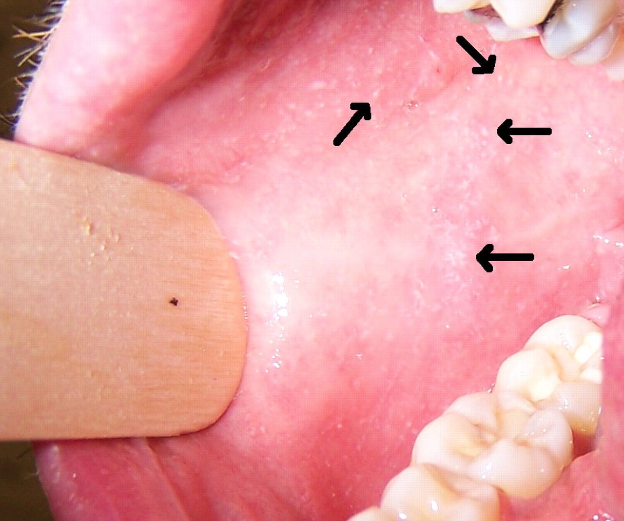 Koplik's spots (also Koplik's sign) are a classic sign of measles that occur two to three days before the measles rash itself appears. The characteristic features of these spots are that they are clustered, white lesions on the buccal mucosa. The other diagnostic signs of measles include 3 C:Cough, coryza and conjunctivitis.
