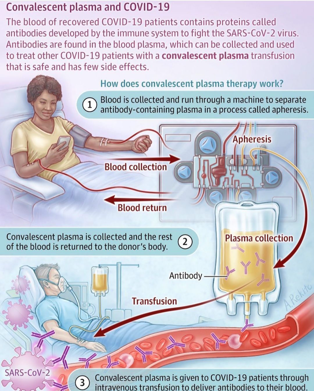 Convalescent plasma is a procedure in which artificially passive immunity is provided by transferring blood plasma from patients who have suffered from the disease already and have recovered to the patients who are currently having the disease. This new plasma can then provide immunity from the disease to the patient because of antibodies that are present in the blood plasma. Convalescent plasma therapy is one of the proposed treatments for COVID-19.