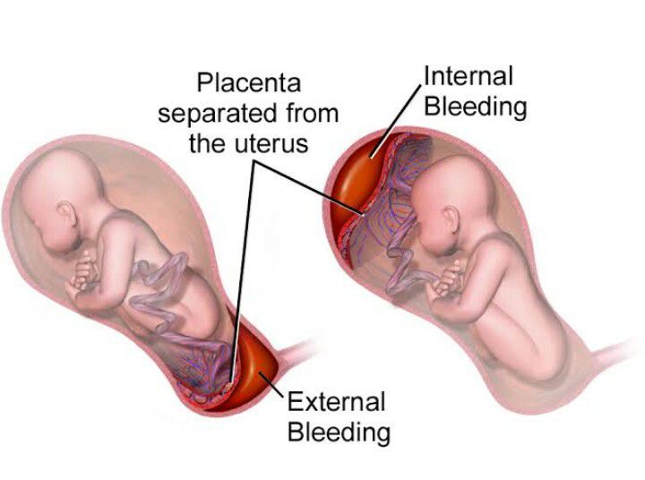 Placental abruption occurs when the placenta partly or completely separates from the inner wall of the uterus before delivery. This can decrease or block the baby's supply of oxygen and nutrients and cause heavy bleeding in the mother. Symptoms: - Vaginal bleeding, although there might not be any - Abdominal pain - Back pain - Uterine tenderness or rigidity - Uterine contractions, often coming one right after another The cause of placental abruption is often unknown. Possible causes include trauma or injury to the abdomen. Patients with previous history of PA, hypertension, trauma, infection and smoking are at higher risk of PA. It might cause mother to go into shock because of excessive bleeding and may cause clotting problems. In the fetus PA may cause restricted growth, premature birth or still birth It is diagnosed theough a physical exam checking for uterine tenderness and rigidity. Ultra sound and some blood tests are also performed. Before 34 weeks if the baby is doing well, patient might be admitted for close monitoring. In babies close to term and compromised condition an urgent C-section is required.