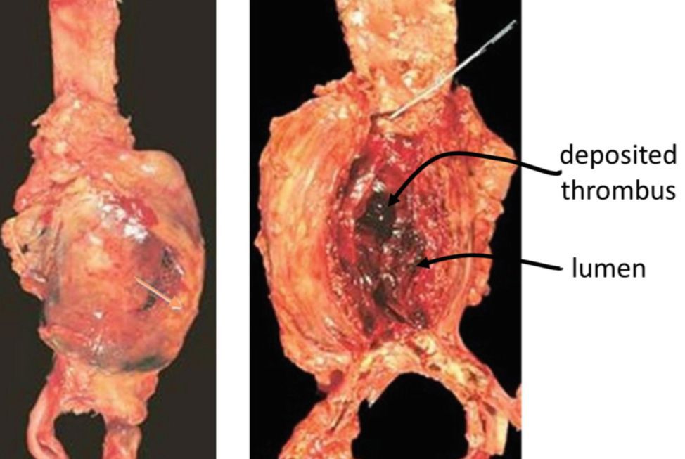 Aortic aneurysm is abnormal balloon like dilatation in the aorta caused by localized weakness and stretching in the wall of aorta. The most common cause of abdominal aortic aneurysm is atherosclerosis. The risk factors are genetic predisposition, smoking and hypertension. Symptoms include abdominal pain and a pulsating abdominal mass.