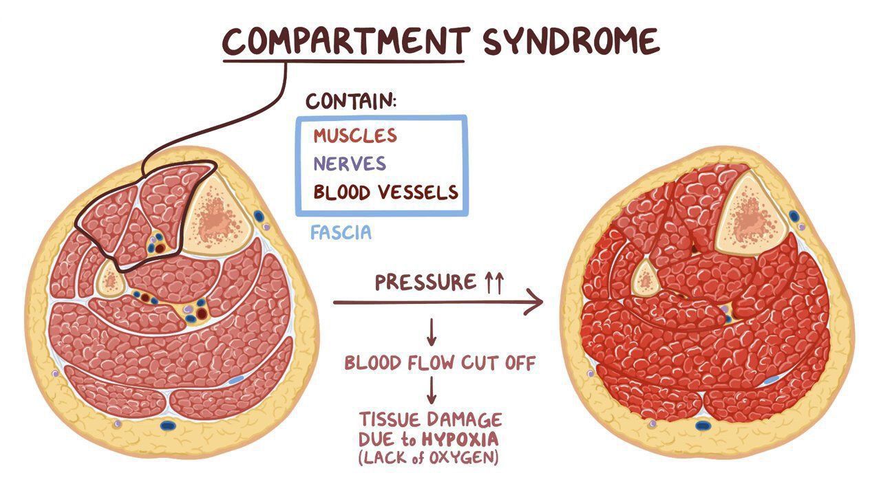 Compartment syndrome is a painful condition which is also a medical emergency. Without treatment it can lead to permanent muscle damage. There are 6 P's to memories clinical findings of compartment syndrome 1. Pain 2. Paresthesia 3. Paralysis 4. Pulselessness 5. Pallor 6. Poikilothermia