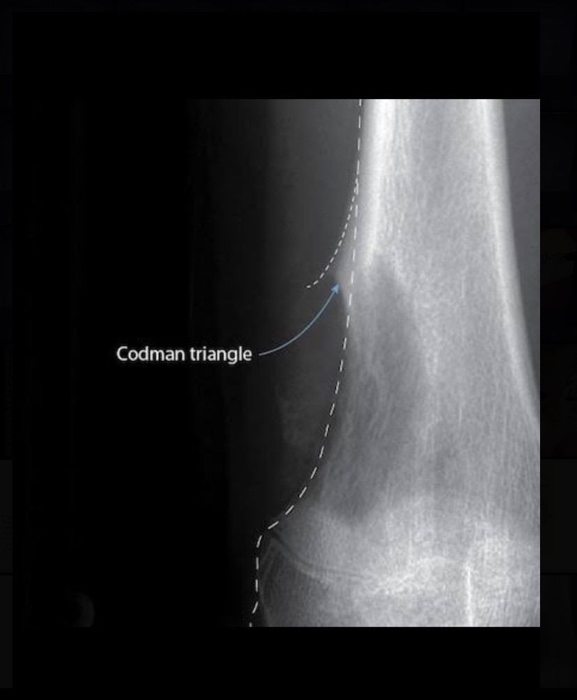 Codman triangle is the subperiosteal elevation of bone due to any tumour or underlying tissue growth that elevates the periosteum giving an appearance of a triangle on radiographic imaging. It is a diagnostic feature for aggressive bone lesions like osteosarcoma, Ewing’s sarcoma, etc. Picture credit: radiopaedia.org