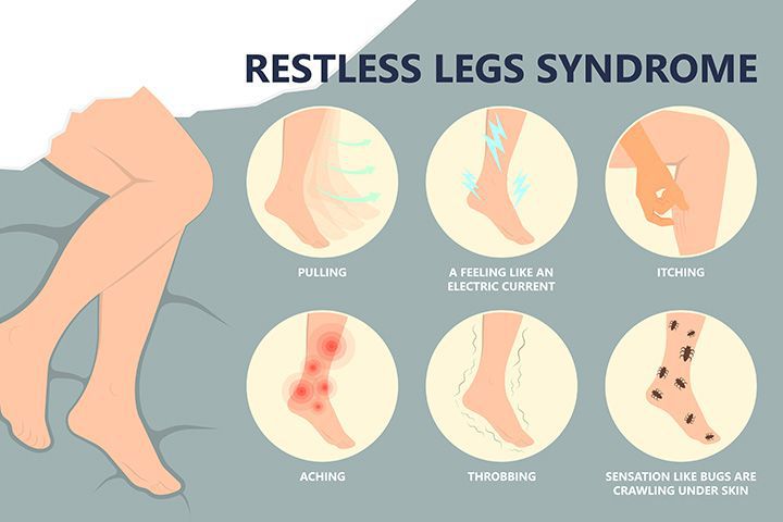 Restless leg syndrome is also known as "Ebkom's syndrome". It affects up to 2% of the population and has a strong familial tendency. It is characterized by an uncomfortable sensation in the legs that is "creepy and crawly" and presents during periods of rest and inactivity. The condition can be aggravated by caffeine intake and is relieved with the movement of the legs. Restless leg syndrome can be a symptom of an underlying condition, such as; peripheral neuropathy, iron deficiency, or uremia. Benzodiazepines and dopamine agonists are helpful in the treatment.