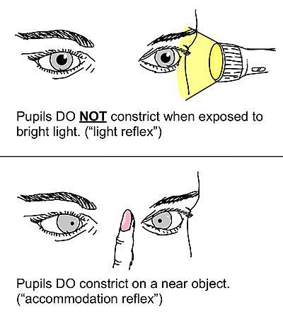 Argyll-Robertson pupils refer to bilateral small pupils that constrict when focusing on a near object i.e. they accommodate but do not constrict when exposed to bright light. They are associated with Tabes Dorsalis, a major form of neurosyphilis (tertiary stage of syphilis), caused by Treponema pallidum.