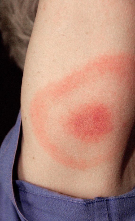 Lyme disease is caused by the bacterium Borrelia burgdorferi which is transmitted to humans via the bite of infected ticks. The characteristic feature of this disease is a red "bull's eye" skin lesion at the bite site which is known as ERYTHEMA MIGRANS. However, erythema migrans is not pathognomonic of this disease. Along with this the patient can also have fever, headache, malaise, arthralgias and regional lymphadenopathy. Once dissemination occurs either through hematogenic or lymphatic routes, neurological involvement may occur like facial nerve palsy, lymphocytic meningitis etc. In advanced disease, patients may also have arthritis, encephalopathy and polyneuritis. Early diagnosis and proper antibiotic treatment of Lyme disease can help prevent late Lyme disease.