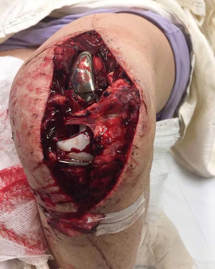 This is a semi-traumatic case, in the sense it’s considered a trauma, however, the etiology of the injury isn’t what we would immediately think traumatic! This knee wound did not happen from a MVA or a knife slip, but from a fall! This happened 3 weeks post op after the patient received a TKA (total knee arthroplasty), aka knee replacement! The fall happened just from standing height which resulted in an apparent dehiscence (rupture along surgical line) of the wound, which completely revealed the hardware. Neurovasculature intact in the area, as well as, down the leg, foot pulses were prominently felt. The unfortunate issue that arse from this fall was the patient was unable to extend the knee past the point viewed in the image which means damage to their new, artificial knee has been done. The patient will have to be taken up to the OR for fixture of the knee, and there, the team can determine the amount of damage that actually has been done. Credit: @trauma_time.