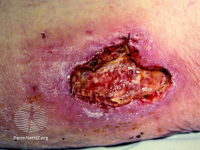 Pyoderma gangrenosum presents with erythematous nodules or pustules which frequently ulcerate. It is a rare disease and its exact etiology is unknown but it is suspected to be an autoimmune disease. The ulcerations begin as small, quick-spreading reddish-purple colored bumps or blisters and eventually become swollen and ulcerated with a typical bluish black undermined edge. The ulcerations can spread and may even become extremely painful. Although their cause is unknown, these ulcerations can also occur in association with certain diseases especially inflammatory bowel disease. Other associations include rheumatoid arthritis, multiple myeloma and leukemia. Image source: dermnetnz.org