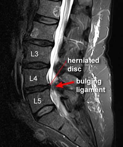 It is common in middle aged and older men. Causes include degenerative changes, trauma, neck/back strain. Most common (95%) is in lumber region especially at L5-S1. History: * Patient presents with severe, electricity-like lower back pain, usually preceded by several months of aching, 'discogenic' pain. * ⬆️Pain = by inc. intra-abdominal pressure = by passive straight leg raise = by crossed straight leg raise * Associated with sciatica, paresthesias, muscle weakness or spasm. * Large midline herniations can cause cauda equina syndrome which is a surgical emergency. Diagnosis: * By positive passive straight leg raise. * MRI is the preferred test. * Obtain ESR and plain x ray if other causes of lower back pain are suspected. Treatment: * Best initial treatment is NSAID in scheduled doses, physical therapy and local heat. * Epidural steroid injection or nerve block is useful in cases not responding to initial therapy. * Surgery is most definitive treatment.