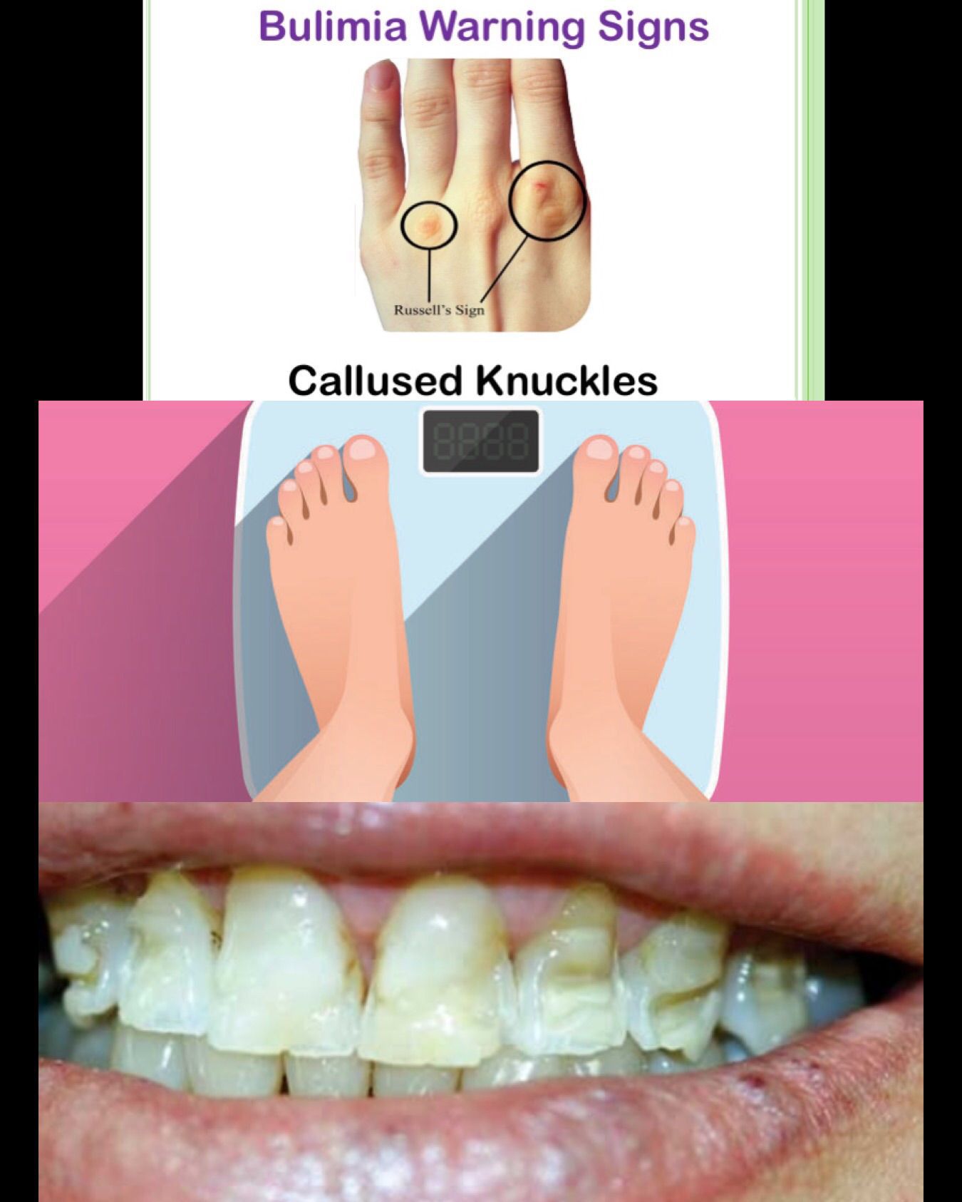 Eating disorder characterised by recurrent episode of binge eating and compensatory purging behaviour (eg; vomiting, diuretic abuse). More common in women and associated with OCD and mood disorders. History - Patient often have a lobg history of other comorbid psychiatric conditions (eg; anxiety, depression) and are concerned about their behaviours. - Sings: dental enamel erosion, enlarged parotid glands, scars on the dorsal hand surfaces (if history repetitive self induced vomiting), and BMI of more than 18.5 kg/m2. Patients with bulimia tend to be more disturbed about their behaviour than patients with anorexia and are therefore more easily engaged in therapy. Treatment: - Psychotherapy plus antidepressants (SSRIs). Treat comorbid psychotic conditions.
