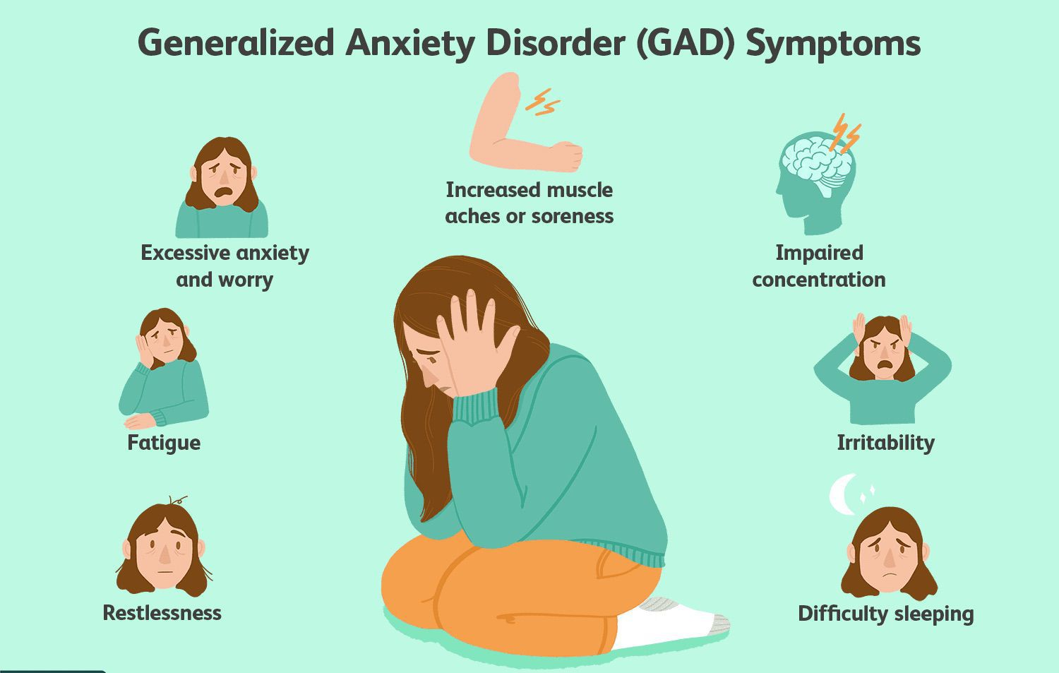 Uncontrollable, excessive worry about multiple activities or events that leads to significant impairment or distress. Clinical onset is usually in early 20s; it is more common in women. The male to female ratio is 1:2. Diagnosis: - Excessive anxiety or worry about multiple activities occurring on most days for more than 6 months. - Symptoms of anxiety are associated with more than 3 somatic symptoms: restlessness, easy fatigue, difficulty concentrating, irritability, muscle tension, sleep disturbances. - Symptoms cause a clinically significant impairment (eg; social m, occupational). - Disturbances are not caused by substances (eg; drugs of abuse, cocaine). - Disturbance is not better explained by another psychiatric disorder (eg; panic attack). Treatment: - Best initial treatment is selective serotonin reuptake inhibitors (SSRIs) eg; fluoxetine, sertraline. - Alternative treatment include serotonin norepinephrine reuptake inhibitors (SNRIs) eg; venlafaxine. - Tricyclic antidepressants (TCA) and benzodiazepines are among short term treatment. - Psychotherapy and lifestyle changes bring visible change in controlling the disorder.