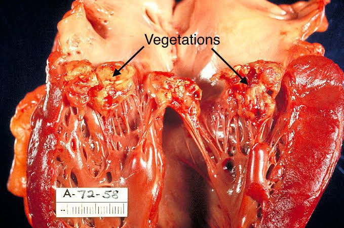 Infective endocarditis is defined as the bacterial infection affecting the valves of heart and endocardium. This results in formation of abnormal growths called vegetations. These vegetations consist of microorganisms and thrombotic debris along with the destruction of involved tissue. It is classified into: Acute endocarditis: Infection by an organism of high virulence with Subacute endocarditis: Infection by low virulence organism. Symptoms are as follows: Fever, heart murmurs, fatigue, chest pain, weakness, hematuria and anemia. Complications includes valvular insufficiency, heart failure, stroke and kidney disease. Picture credit: Wikipedia