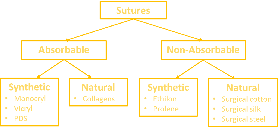 Suture materials are mainly classified as absorbable or non-absorbable with other sub-classes which include natural or synthetic and monofilament or multifilament. Absorbable sutures are opted for sites that heal rapidly (e.g. small bowel anastomosis) as they are broken down by enzymatic reactions of the body. Non-absorbable sutures are preferred for slow healing tissues (e.g. fascia or tendons) as they remain isolated from inflammatory reaction. Further reading about this topic can be done at: https://teachmesurgery.com/skills/surgical-equipment/suture-materials/ Image Source: https://teachmesurgery.com/skills/surgical-equipment/suture-materials/