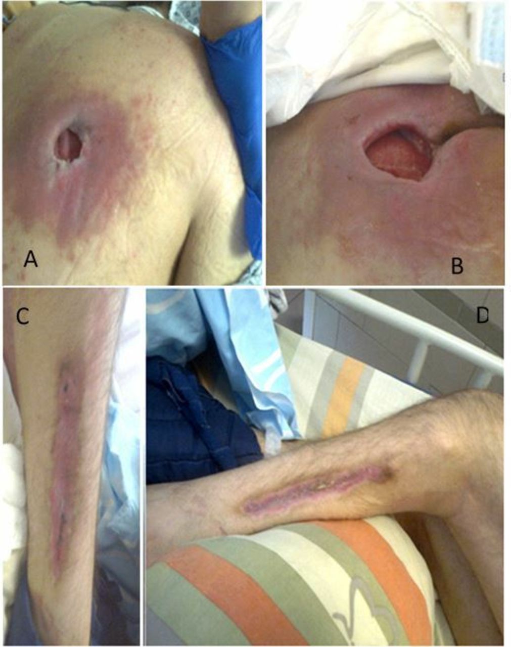 When they begin they start with discoloration and progress to these sores through various stages from the discoloration being unstageable and then a 1 to 4 grading . Some other treatments may also include application of a woundvac to keep clean and promote healing.