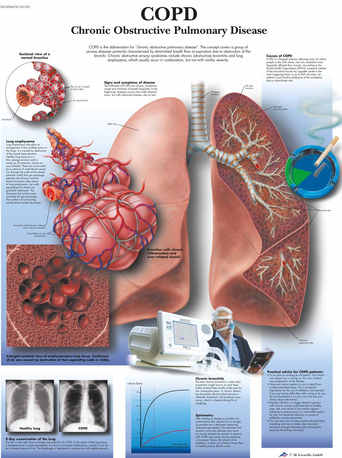 Chronic obstructive pulmonary disease (COPD) is a chronic inflammatory lung disease that causes obstructed airflow from the lungs. Symptoms include breathing difficulty, cough, mucus (sputum) production and wheezing. The cause of COPD is usually long-term exposure to irritants that damage your lungs and airways. In the United States, cigarette smoke is the main cause. Pipe, cigar, and other types of tobacco smoke can also cause COPD, especially if you inhale them. Exposure to other inhaled irritants can contribute to COPD. diagnosis is confirmed by a simple test called spirometry, which measures how deeply a person can breathe and how fast air can move into and out of the lungs. For most people with COPD, short-acting bronchodilator inhalers are the first treatment used. Bronchodilators are medicines that make breathing easier by relaxing and widening your airways. There are 2 types of short-acting bronchodilator inhaler: beta-2 agonist inhalers – such as salbutamol and terbutaline. And antimuscarinic inhalers – such as ipratropium.