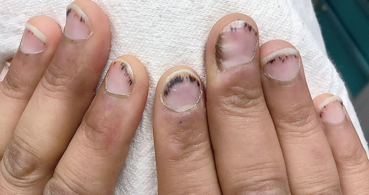 Splinter hemorrhages are small blood spots that are visible underneath the nail. There many causes of splinter hemorrhages,one of the most dangerous one is infective endocarditis that is infection of the heart valves. Other causes are hemodialysis, antiphospholipid syndrome and vasculitis.