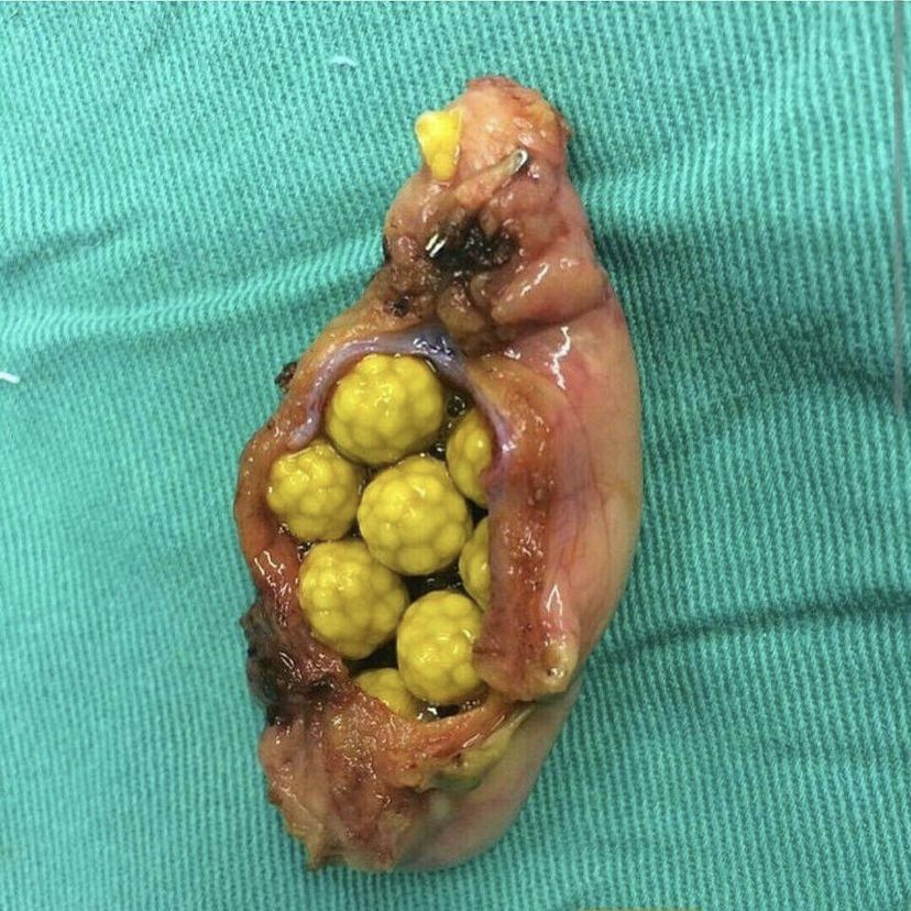 Cholelithiasis is a condition characterised by the presence of gallstones in the gallbladder. Stones can be of two major types: Pigment stones: Pale yellow colour stones found in gallbladder exclusively Cholesterol stones: Black or brown colour stones found in biliary tree The picture shown above is of cholesterol gallstones. Picture credit: @medicase_original (via Instagram) https://www.instagram.com/p/CJ4UhXwh4NJ/?igshid=1mvxnwq4u7lk