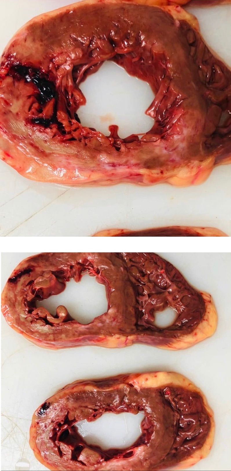 Ventricular rupture following MI This is the heart of a 79 year old male smoker showing rupture of the left ventricular wall following Myocardial infarction. Rupture of the free wall led to accumulation of the blood between the heart muscle and pericardium. This resulted in cardiac tamponade. Classical signs of cardiac tamponade are hypotension, distant heart sounds and jugular vein distension also called Beck’s triad. Picture credit: @themedicalmentors (via Instagram) https://www.instagram.com/p/CNh2p9MnaOY/?igshid=sa77a1qng4s1