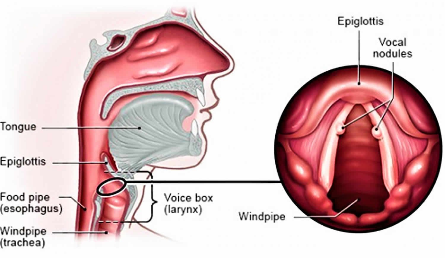 Vocal nodules are swelling that appear in the lining membrane of the vocal cords and its composing tissue. This conditions usually results due to over and intense use of voice over long periods of time (such as screaming or singing). Vocal nodules present most commonly with hoarseness of voice. This conditions is usually diagnosed by an ENT specialist by the use of a laryngoscope which can help visualise the nodules. The main treatment and preventive measure is voice rest and/or speech therapy and if resistant to then surgical removal. Text Reference: https://www.ncbi.nlm.nih.gov/books/NBK534635/ Image Source: https://healthjade.net/vocal-nodules/